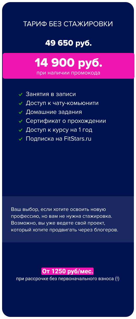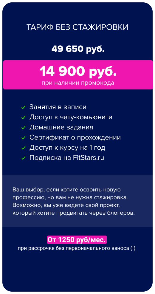 Студенты, успешно прошедшие курс и выполнившие задания, попадают на стажировку в FitStars.ru. Пройдя стажировку уже через месяц вы сможете вернуть затраты на обучение и сформируете свое портфолио! А еще через месяц вы можете рассчитывать на такой доход в новой профессии
